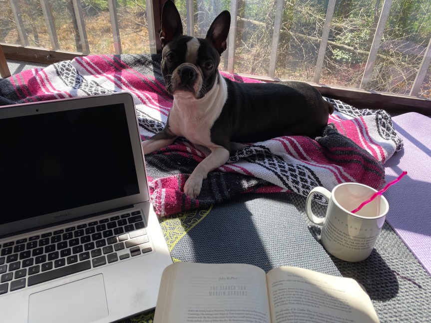 It’s impossible to tune out all distractions. In my dorm, I could close my door and put in headphones. There’s no door to close here. Sometimes I’ve been wearing headphones for so long that my ears hurt. So I let Loki run around barking and playing, I let my family operate with their noise.
